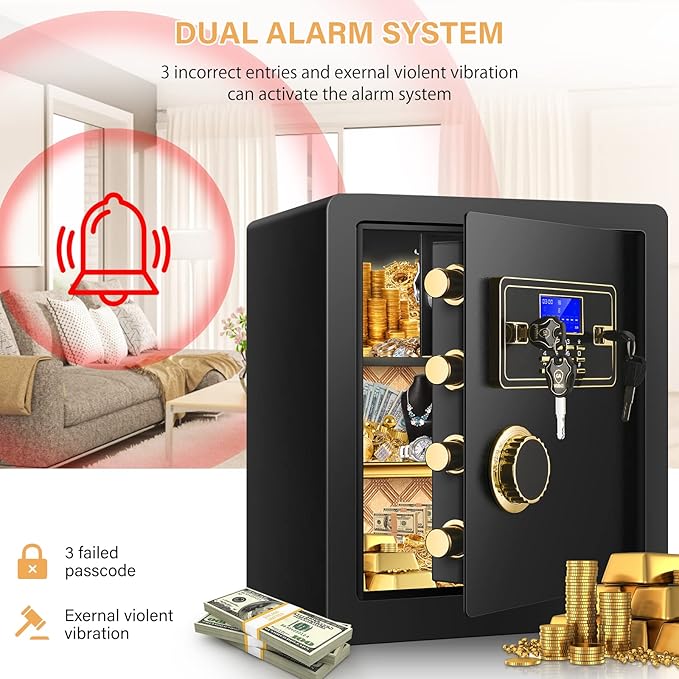 • ?【DUAL SECURITY ALARM】Our safe comes with a dual alarm system, the alarm will be issued when the thief enter wrong password 3 times or your safe is hit hard. The alert will go on for 60 seconds unless you enter the correct password