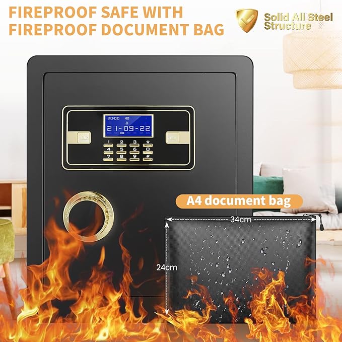 2.12 Cub Safe Box Fireproof Waterproof, Security Home Safe with Fireproof Document Bag, Large Fireproof Safe Box for Home with Inner Cabinet and LCD Display, Safe Box for Money Jewelry Documents