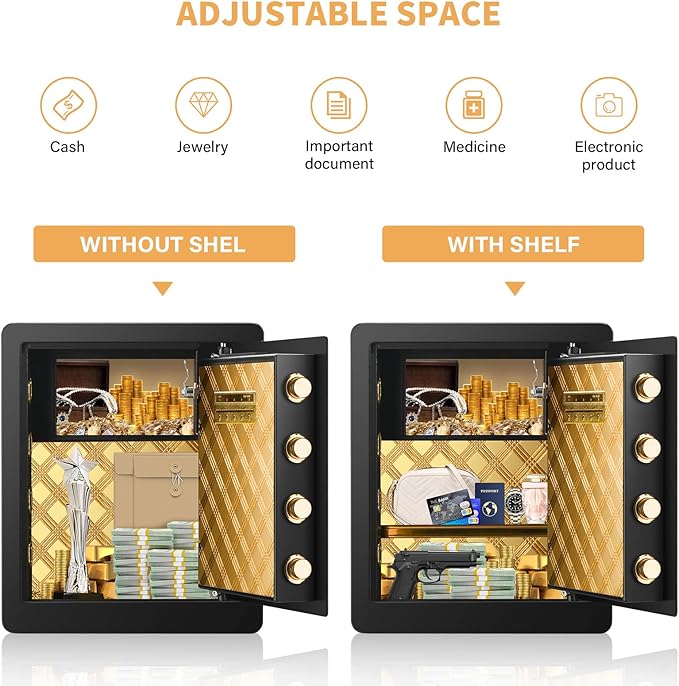• ?【REMOVABLE SHELF AND BUILT IN COMPARTMENT】Removable shelf can help you organize your important things easily. The inside locking box adds one more protection for your privacy. The built-in Led light provides increased visibility so you can easily access your valuables in the dark