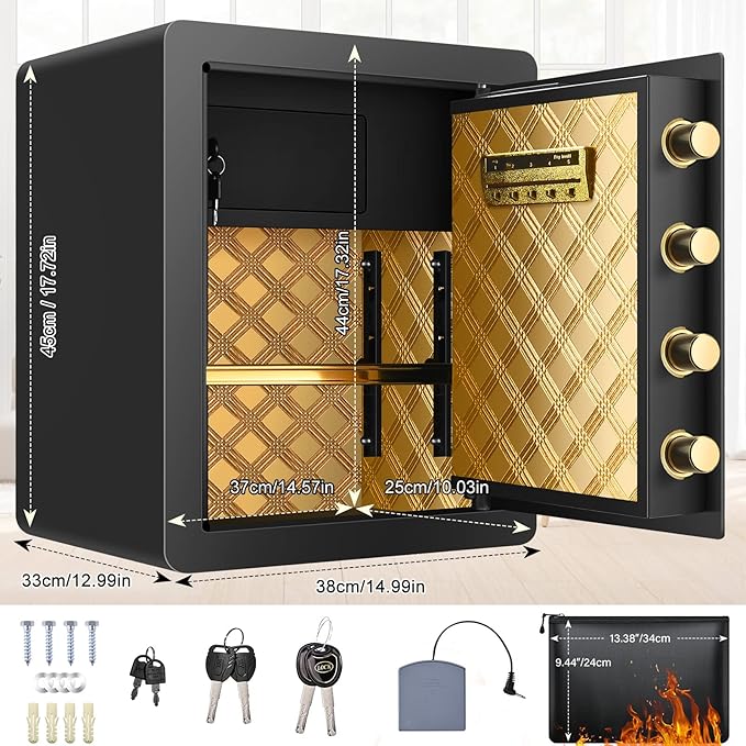 • ?【LARGE HOME SAFE FIREPROOF WATERPROOF】2.1 CUBIC FEET CAPACITY, the external size is 14.9" x 12.2" x 17.7", interior size is 14.5" x 11.4" x 15.7". Our safe box is euipped with waterproof and firproof document bag, you can use it to store cash, jewellery, important documents and protect your valuables from fire, hurricanes and earthquakes