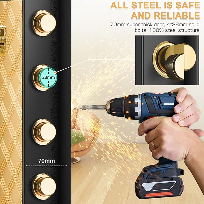 • ?【PRY-RESISTANT AND STEEL STRUCTURE】Safe box is made from solid cold rolled steel, with thickened 28 mm quadruple lock cores, which is excellent in anti-collision, anti-drilling, high temperature resistance. 78mm thickened solid door panel, laser-cut 1mm micro seam, which is the key to fireproof, anti-prying and anti-drilling
