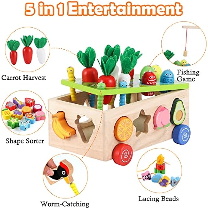 • Fully Upgraded Toddler Toys Age 2-4: The cute wood toy kit offers variety of preschool learning activities for kids, including fishing, carrot harvest, shape sorting, fruit & animal recognition, worm-catching game and more. And baby can push or pull the playful car using the cord. All the learning game will keep your toddlers occupied and entertained, decreasing screentime, your kids will definitely want to play it over and over!