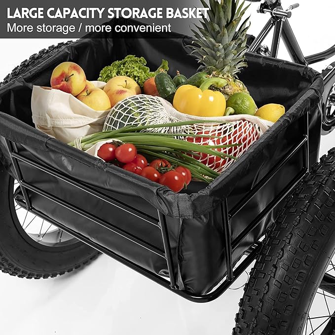 • SPACIOUS SHOPPING BASKET — Our three wheel bikes with a (L=12", W=20", H=9") shopping basket that provides more storage space for your trips or shopping. It is also thoughtfully equipped with a waterproof canvas bag that not only prevents loose items from falling, but also prevents sewage from muddy roads.