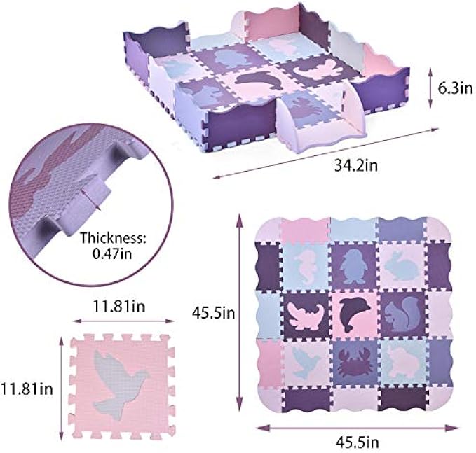 • ?Baby Crawling Play Mat- Flat Size: 45.5’’ x 45.5’’, Fence Up: 34.2’’ x 34.2’’, Fence Height: 6.3’’, and Each Square Tile is about 11.81’’ x 11.81’’; approx. 0.47’’ Thickness mat comfortably cushions spine, hips, knees and elbows on hard floors