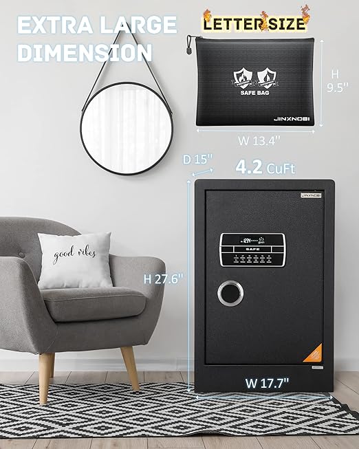 • [Big Personal Safe At Home] JINXNOBI safes with well-designed look, proper size and textured black color, makes the cabinet safe suit for home use and office use. Fireproof and waterproof safe bag to be put your files, passport, ID cards. Excellent quality with extremely high-level anti-theft alarm function, safe for securing your valuables, important documents, jewelry, cash and guns.