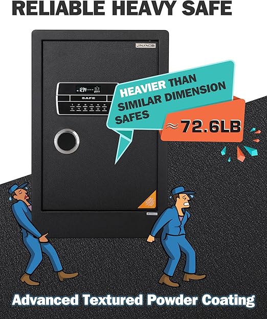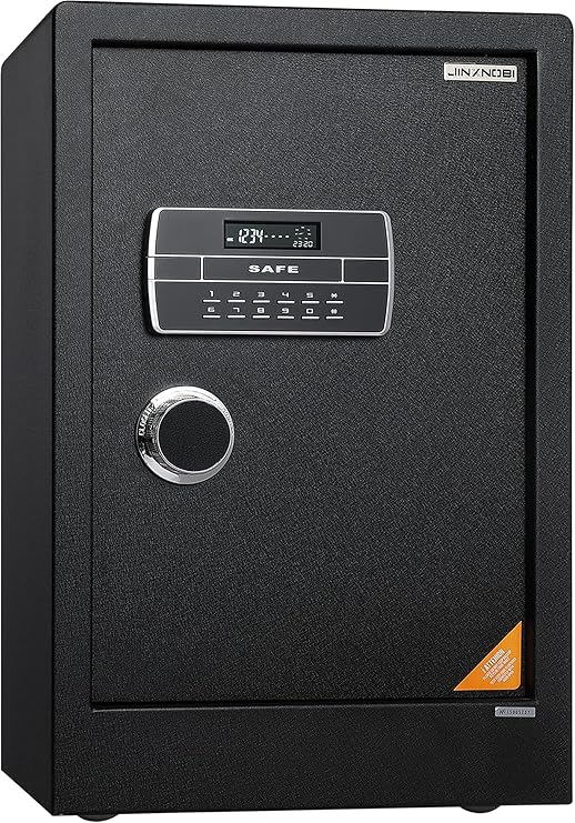• [Fire and Waterproof Safe Box] JINXNOBI digital security safe box with A4 letter size fireproof waterproof safe bag, to protect your important documents. Heavy of 75LB weighted, sturdiness of 10mm steel door and 2mm steel body, 5 live bolts to protect from forced entry. Advanced Aanti-theft protection prevents again break-in to secure your valuables.Inner locker box and large capacity for documents, jewelry, money, guns.