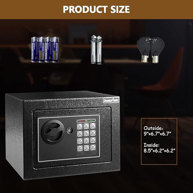 • √Exquisite Capicity:0.23-cubic-feet, Exterior :9" x 6.7"x 6.7", Interior size: :8.6" x 6.4" x 6.4" (Please pay full attention to the dimension for this smart safe box before you buy it ).In order to better serve customers, we have used better mechanical devices on the door, but when this device is used for the first time, it is sometimes not easy to open easily, and it takes patience to try a few more times.
