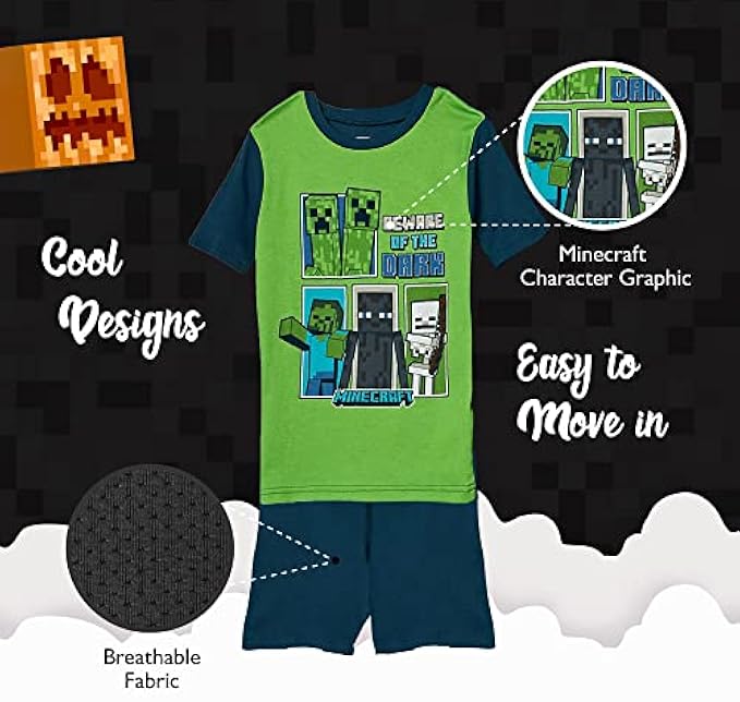 • ENJOYABLE BEDTIME: These fun “Minecraft” pajamas for boys come in a variety of styles and feature charming graphics and bright colors. These boys’ short-sleeve pajamas are available in sizes 4–12.
