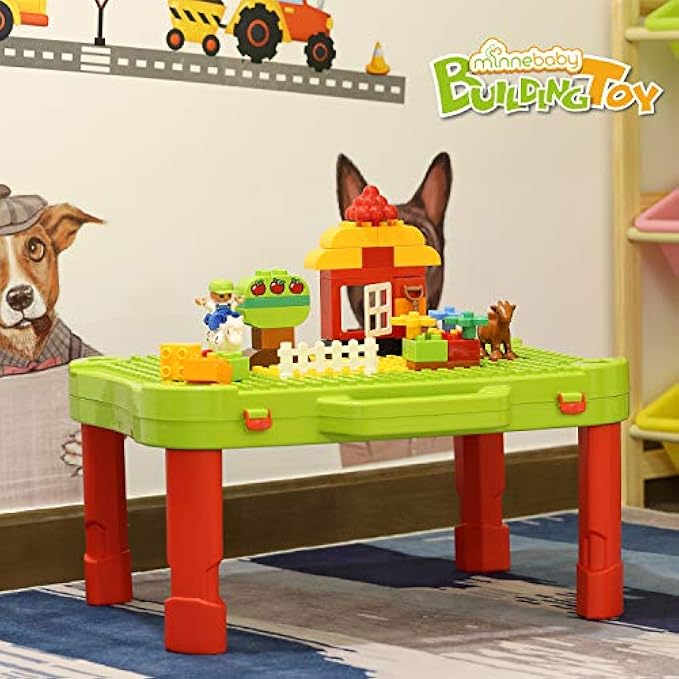 Minnebaby 3-in-1 Kids Activity Table, Compatible for Lego Duplo and Mega Blocks, Build and Learn Table, Building Blocks Kit - Foldable Activity Desk, Play Board, and Toy Storage for Toddlers