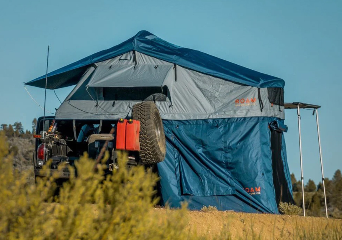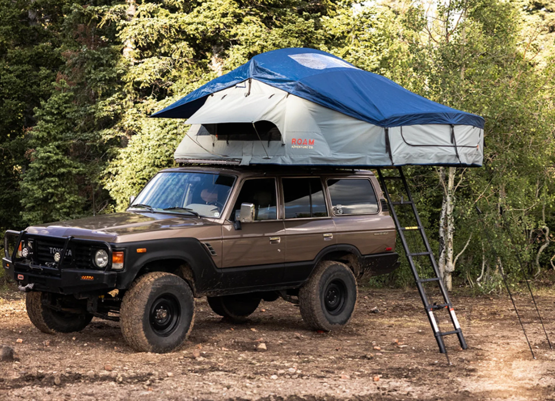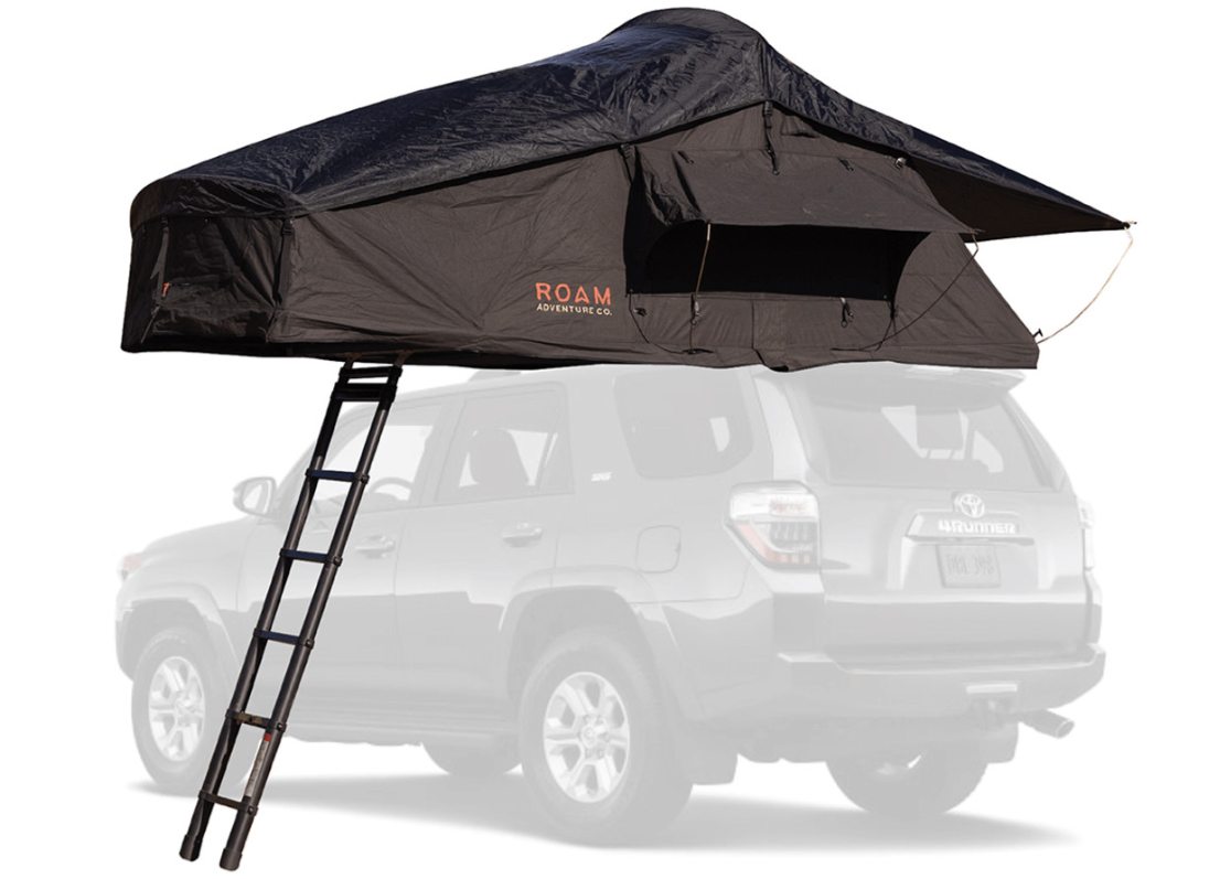 The ROAM Vagabond XL is a durable foldout rooftop tent that sleeps 4 people on top of a high-density foam mattress. This all-weather tent can be easily installed on a variety of standard roof racks and takes minutes to pitch, wherever you find yourself at the end of the day. Both the tent and its rainfly are made of rugged, polycotton, ripstop fabric and a lightweight telescoping aluminum ladder allows for easy access to your unfoldable home off the ground. The skylight and three windows can be unzipped for maximum views of the night sky and morning sunrise.