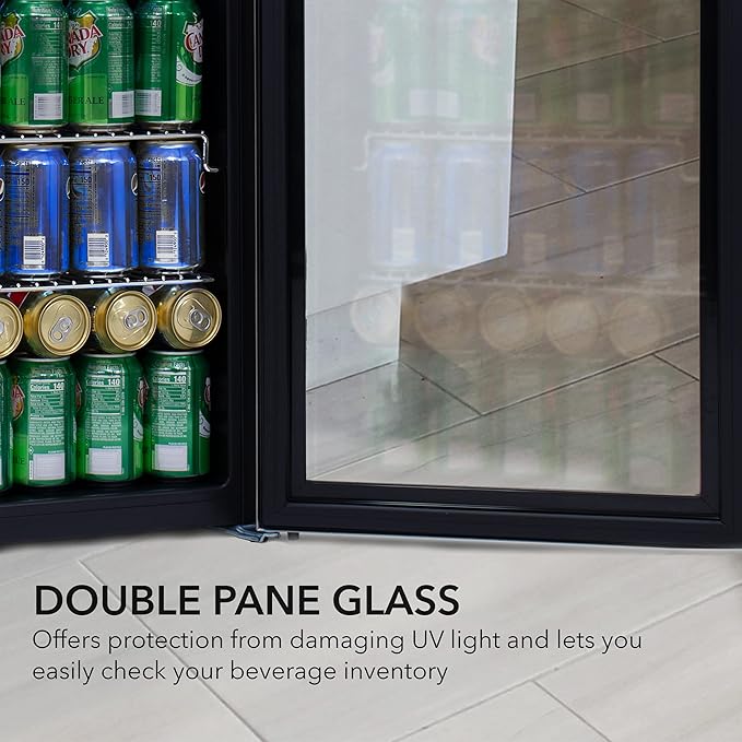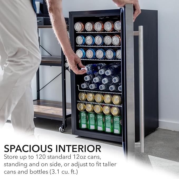 • 120-Can Capacity: Equipped with 5 slide-out wire shelves, our small fridge-style beverage cooler is capable of storing and cooling up to 120 standard 12-oz. cans